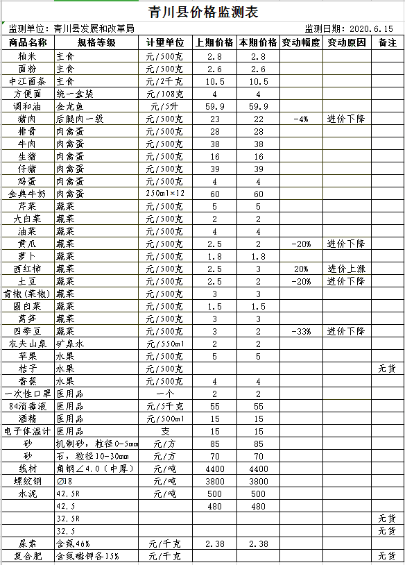青川县价格监测表