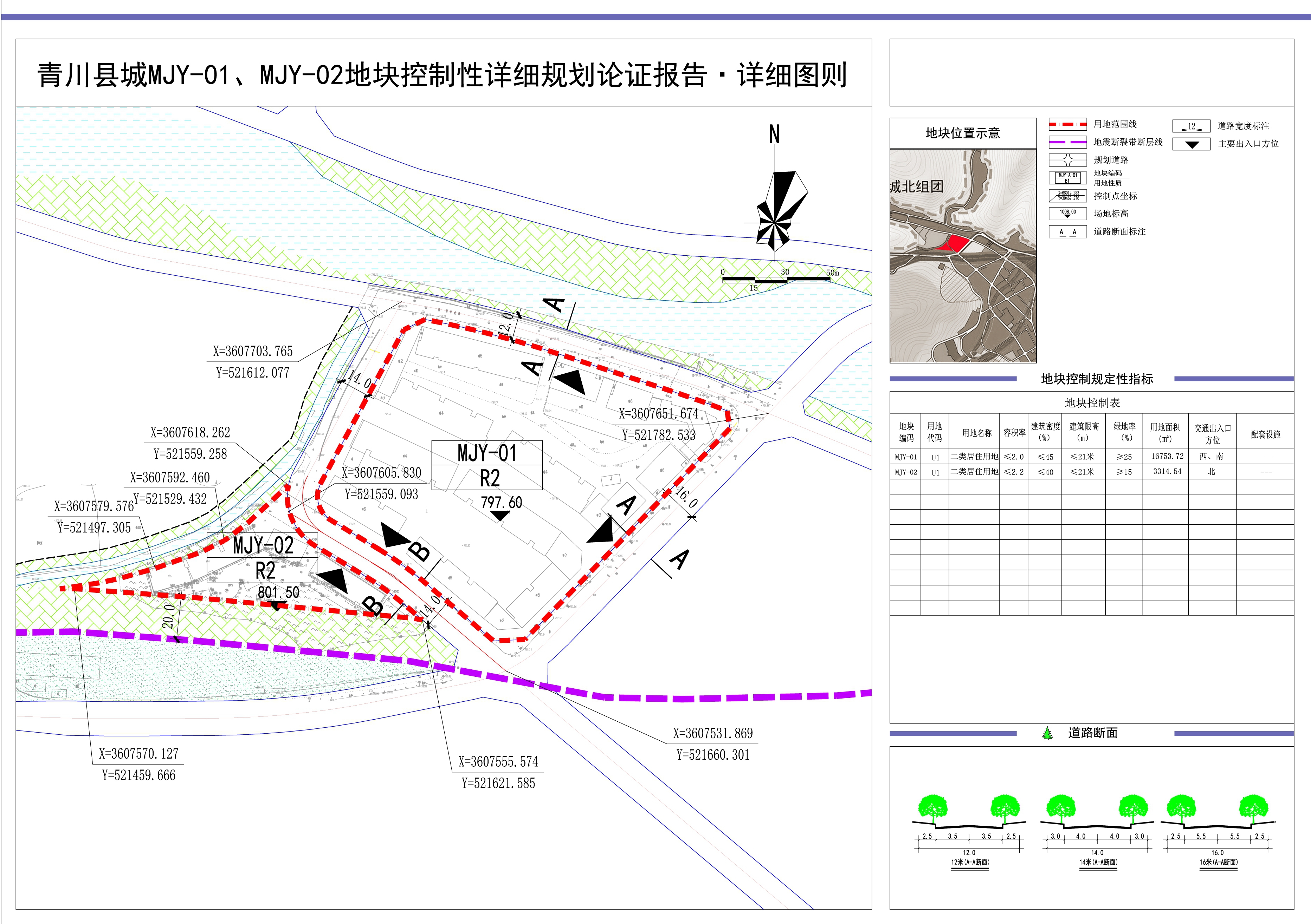 (2)青川县城MJY-02地块:用地面积3314.53平方米;用地性质:二类居住用地;容积率:≤2.2;建筑密度:≤40%;绿地率:≥15%;建筑高度:≤21米;交通出入口方位:北侧。