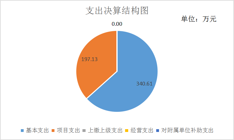 2019年本年支出合计537.74万元,其中:基本支出340.61万元,占63.34%;项目支出197.13万元,占36.66%;上缴上级支出0.00万元,占0.00%;经营支出0.00万元,占0.00%;对附属单位补助支出0.00万元,占0.00%。