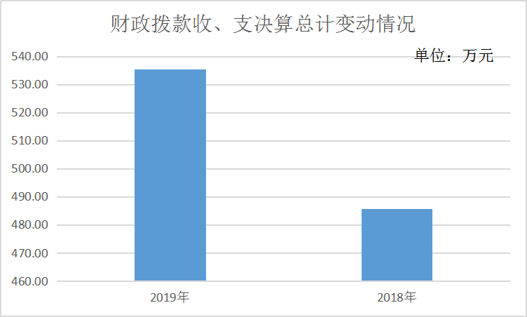 2019年度收、支总计535.32万元。与2018年相比,收、支总计各增加49.5万元,增长10.19%。主要变动原因是编制内实有人数增加,导致人员基本支出及日常事务公用支出收支增加。