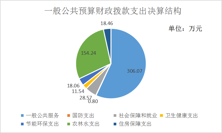 2019年一般公共预算财政拨款支出537.74万元,主要用于以下方面:一般公共服务(类)支出306.07万元,占56.92%;国防支出(类)0.80万元,占0.01%;社会保障和就业(类)支出28.57元,占5.31%;卫生健康支出(类)11.54万元,占2.15%;节能环保支出(类)18.06万元,占3.36%;农林水支出(类)154.24万元,占28.68%;住房保障支出(类)18.46万元,占3.43%。