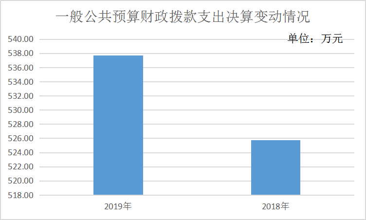 2019年一般公共预算财政拨款支出537.74万元,占本年支出合计的100.00%。与2018年相比,一般公共预算财政拨款增加11.95万元,增长2.27%。主要变动原因是编制内实有人数增加,导致人员基本支出及日常事务公用支出收支增加。