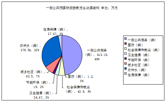 2019年一般公共预算财政拨款支出871.47万元,主要用于以下方面:一般公共服务(类)支出413.18万元,占47.41%;国防(类)支出1.2万元,占0.14%;社会保障和就业(类)支出43.9万元,占5.04%;卫生健康(类)支出24.67万元,占2.83%;节能环保(类)支出19万元,占2.18%;城乡社区(类)支出63.5万元,占7.29%;农林水(类)支出278.56万元,占31.96%;住房保障(类)支出27.47万元,占3.15%。