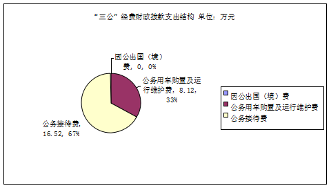 2019年“三公”经费财政拨款支出决算中,因公出国(境)费支出决算0万元,占0%;公务用车购置及运行维护费支出决算8.12万元,占32.95%;公务接待费支出决算16.52万元,占67.05%。具体情况如下: