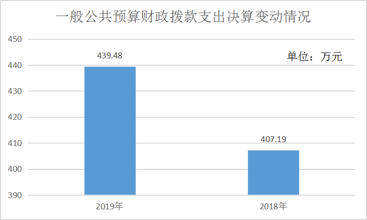 2019年一般公共预算财政拨款支出439.48万元,占本年支出合计的100%。与2018年相比,一般公共预算财政拨款增加32.29万元,增长7.35%。主要变动原因是编制内实有人数增加,导致人员基本支出及日常事务公用支出收支增加。
