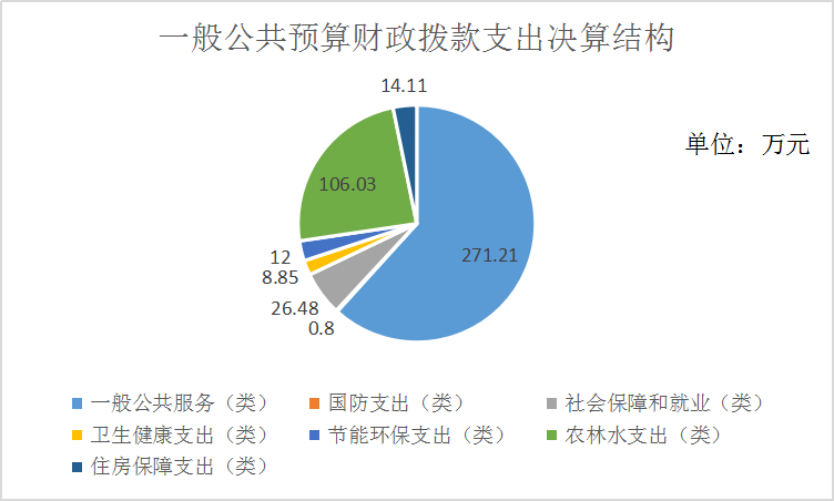 2019年一般公共预算财政拨款支出439.48万元,主要用于以下方面:一般公共服务(类)支出271.21万元,占61.71%;国防支出(类)0.80万元,占0.02%;社会保障和就业(类)支出26.48元,占6.1%;卫生健康支出(类)8.85万元,占2.01%;节能环保支出(类)12万元,占2.7%;农林水支出(类)106.03万元,占24.13%;住房保障支出(类)14.11万元,占3.33%。