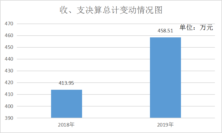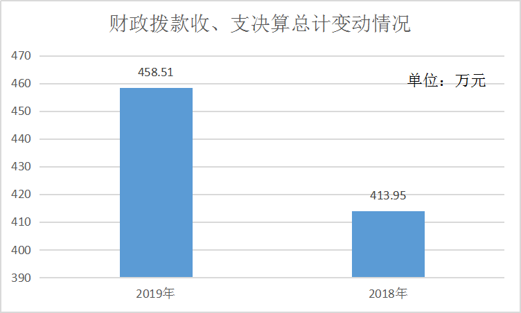 2019年度收、支总计458.51万元。与2018年相比,收、支总计各增加44.56万元,增长9.71%。主要变动原因是编制内实有人数增加,导致人员基本支出及日常事务公用支出收支增加。