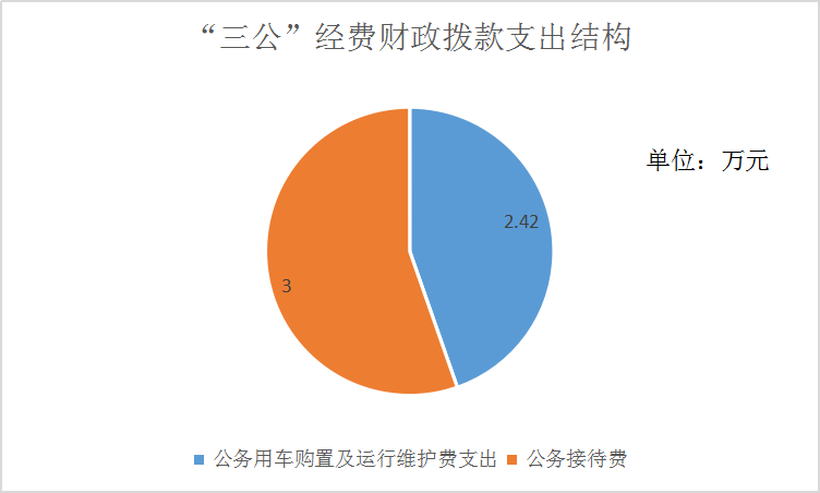 2019年“三公”经费财政拨款支出决算中,因公出国(境)费支出决算0万元,占0%;公务用车购置及运行维护费支出决算2.42万元,占60.5%;公务接待费支出决算3万元,占75%。具体情况如下: