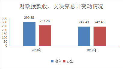 2019年财政拨款总计收入242.43万元、支出242.43万元。与2018年相比,总计收入减少56.95万元,支出减少14.85万元,收入下降19%,支出下降5.8%。