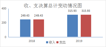 2019年度收入总计249.43万元,支出总计249.43万元。与2018年相比,收入总计减少66.5万元、支出减少66.5万元,下降21%。主要变动原因是一般公共预算财政拨款收入减少。(图1:收、支决算总计变动情况图)