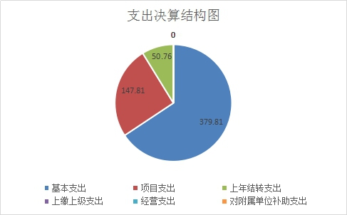 2019年本年支出合计578.38万元,其中:基本支出379.81万元,占65.67%;项目支出147.81万元,占25.56%;上年结转支出50.76万元,占8.77%;上缴上级支出0万元,占0%;经营支出0万元,占0%;对附属单位补助支出0万元,占0%。