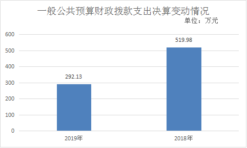2019年一般公共预算财政拨款支出292.13万元,占本年支出合计的100.00%。与2018年相比,一般公共预算财政拨款减少227.85万元,减少43.82%。主要变动原因是压缩一般性开支和年底调整预算指标追减。
