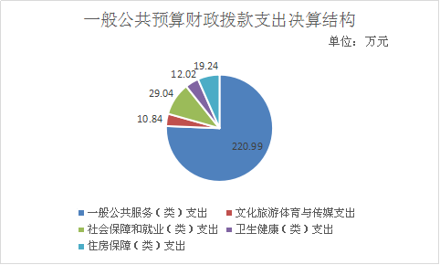 2019年一般公共预算财政拨款支出292.13万元,主要用于以下方面:一般公共服务(类)支出220.99万元,占75.65%;文化旅游体育与传媒支出10.84万元,占3.71%;社会保障和就业(类)支出29.04元,占9.94%;卫生健康支出(类)12.02万元,占4.11%;;住房保障支出(类)19.24万元,占6.59%。
