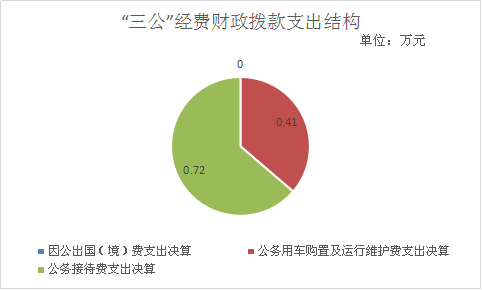2019年“三公”经费财政拨款支出决算中,因公出国(境)费支出决算0.00万元,占0.00%;公务用车购置及运行维护费支出决算0.41万元,占36.28%;公务接待费支出决算0.72万元,占63.72%。具体情况如下: