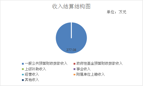 2019年本年收入合计277.08万元,其中:一般公共预算财政拨款收入277.08万元,占100.00%;政府性基金预算财政拨款收入0.00万元,占0.00%;上级补助收入0.00万元,占0.00%;事业收入0.00万元,占0.00%;经营收入0.00万元,占0.00%;附属单位上缴收入0.00万元,占0.00%;其他收入0.00万元,占0.00%。