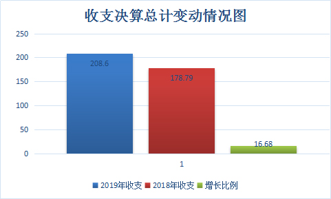 2019年度收、支总计208.6万元。与2018年相比,收、支总计各增加29.81万元,增长16.68%。主要变动原因是追加了2017年目标奖。