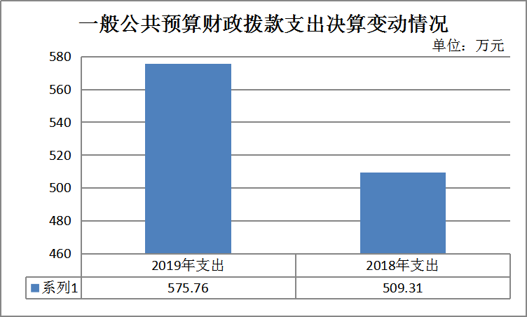 2019年一般公共预算财政拨款支出575.76万元,占本年支出合计的100%。与2018年相比,一般公共预算财政拨款增加66.45万元,增长13%。主要变动原因是编制内实有人数增加,导致人员基本支出及日常事务公用支出收支增加。