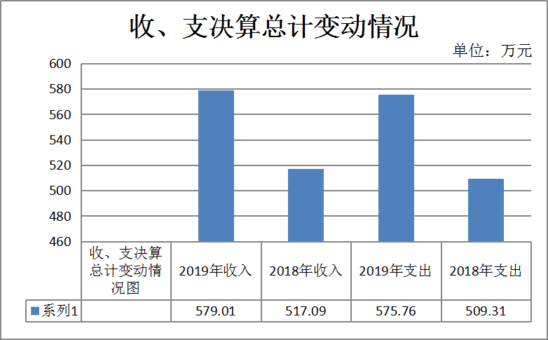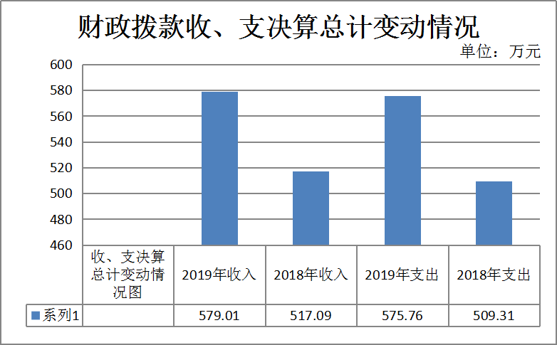 2019年度财政拨款收入总决算579.01万元,与2018年517.09万元相比,财政拨款收入总计增加61.92万元,增长11.9%;支出总决算575.76万元,与2018年509.31万元相比,财政拨款支出总计增加66.45万元,增长13%。
