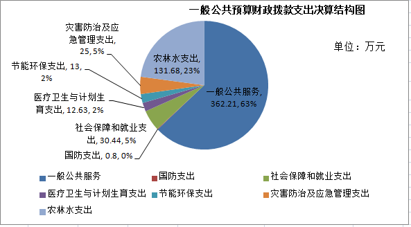 2019年一般公共预算财政拨款支出575.76万元,主要用于以下方面:一般公共服务(类)支出362.21万元,占63%;国防支出0.8万元,占0.01%;社会保障和就业支出30.44万元,占5%;医疗卫生与计划生育支出12.63万元,占2%;节能环保支出13万元,占2%;农林水支出131.68万元,占23%;灾害防治及应急管理支出25万元,占5%。
