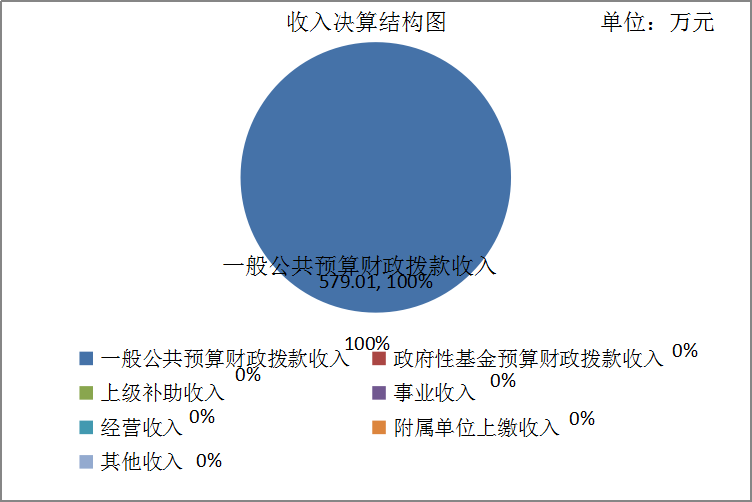 2019年本年收入合计579.01万元,其中:一般公共预算财政拨款收入579.01万元,占100%;政府性基金预算财政拨款收入0万元,占0%;上级补助收入0万元,占0%;事业收入0万元,占0%;经营收入0万元,占0%;附属单位上缴收入0万元,占0%;其他收入0万元,占0%。