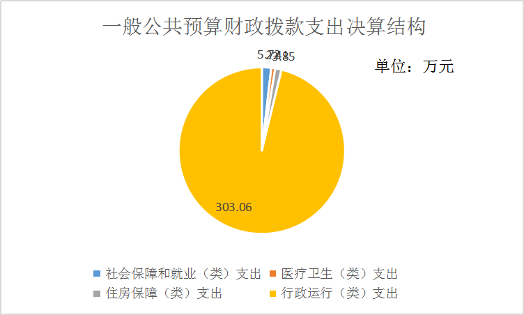 2019年一般公共预算财政拨款支出315.04万元,主要用于以下方面:一般公共服务(类)支出315.04万元,主要用于以下方面:社会保障和就业(类)支出5.72万元,占1.82%;医疗卫生(类)支出2.41万元,占0.76%;住房保障(类)支出3.85万元,占1.22%;行政运行(类)支出303.06万元,占96.2%。