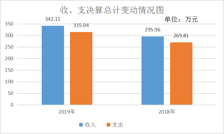 2019年度收入总计342.11万元,与2018年相比,收入总计增加46.15万元,增加13.49%;支出总计315.04万元,与2018年相比,支出增加45.23万元,增加16.76%。主要变动原因:2017年目标考核奖金记入2019年决算指标。