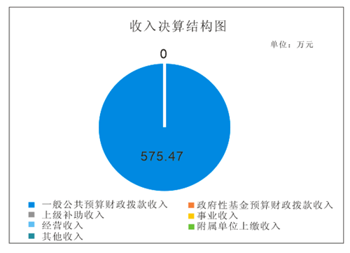 2019年本年收入合计575.47万元,其中:一般公共预算财政拨款收入575.47万元,占100%;政府性基金预算财政拨款收入0万元,占0%;上级补助收入0万元,占0%;事业收入0万元,占0%;经营收入0万元,占0%;附属单位上缴收入0万元,占0%;其他收入0万元,占0%。
