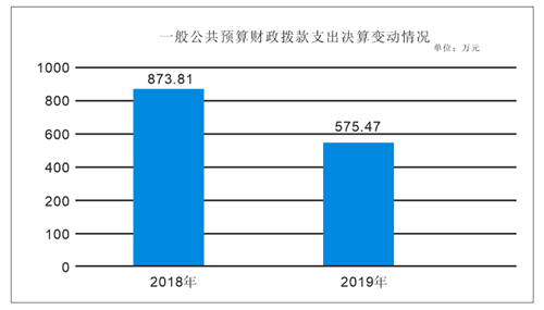 2019年一般公共预算财政拨款支出575.47万元,占本年支出合计的100%。与2018年相比,一般公共预算财政拨减少298.34万元,下降34.14%。主要变动原因是日常公用经费、基础设施建设、办公设备、专用设备等费用减少。