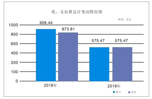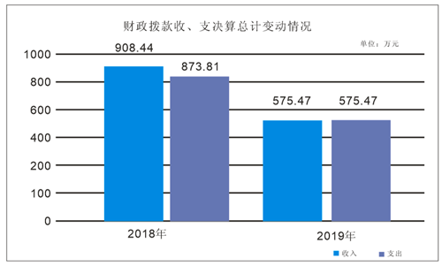 2019年度收入575.47万元、支总计575.47万元。与2018年相比,收入减少332.97万元,下降,36.65%、支总计减少298.34万元,下降34.14%。主要变动原因是日常公用经费、基础设施建设、办公设备、专用设备等费用减少。