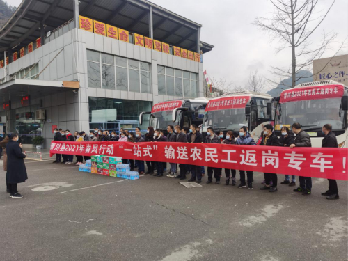 2021年3月3日上午,青川县2021年春风行动“一站式”输送农民工返岗专车再发车,此次约60名青川籍农民工搭乘2辆农民工返岗免费专车,分别到浙江省湖州市、杭州市就业。截至目前,全县已开通返岗专车91车次,输送返岗农民工3214人,全县累计返岗农民工21123人。