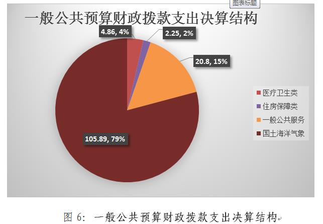 2019年一般公共预算财政拨款支出133.79万元,主要用于以下方面:医疗卫生(类)支出4.86万元,占3.63%;住房保障(类)支出2.25万元,占1.68%;一般公共服务支出20.8万元,占15.54%;国土海洋气象等支出105.89万元,占79.15%。