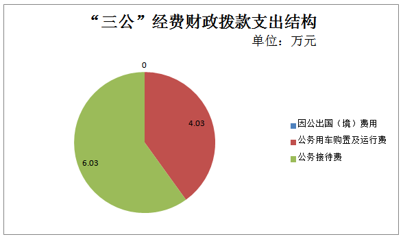 2019年“三公”经费财政拨款支出决算中,因公出国(境)费支出决算0万元,占0%;公务用车购置及运行维护费支出决算4.03万元,占40.06%;公务接待费支出决算6.03万元,占59.94%。