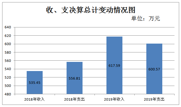2019年度收、支总计617.59万元。与2018年相比,收、支总计各增加82.14万元,增长15.34%。主要变动原因是编制内实有人数增加,导致人员基本支出及日常事务公用支出收支增加。