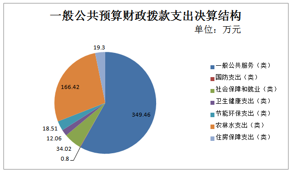 2019年一般公共预算财政拨款支出600.57万元,主要用于以下方面:一般公共服务(类)支出349.46万元,占58.19%;国防支出(类)0.8万元,占0.13%;社会保障和就业(类)支出34.02元,占5.66%;卫生健康支出(类)12.06万元,占2.01%;节能环保支出(类)18.51万元,占3.08%;农林水支出(类)166.42万元,占27.71%;住房保障支出(类)19.3万元,占3.22%。