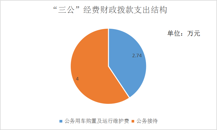 2019年“三公”经费财政拨款支出决算中,因公出国(境)费支出决算0万元,占0%;公务用车购置及运行维护费支出决算2.74万元,占40.65%;公务接待费支出决算4万元,占59.35%。具体情况如下:
