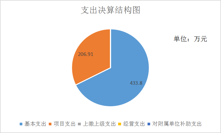 2019年本年支出合计640.71万元,其中:基本支出433.8万元,占67.71%;项目支出206.91万元,占32.29%;上缴上级支出0万元,占0%;经营支出0万元,占0%;对附属单位补助支出0万元,占0%。