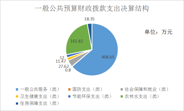 2019年一般公共预算财政拨款支出640.71万元,主要用于以下方面:一般公共服务(类)支出408.65万元,占63.78%;国防支出(类)0.80万元,占0.01%;社会保障和就业(类)支出27.62元,占4.31%;卫生健康支出(类)11.47万元,占1.79%;节能环保支出(类)12万元,占1.87%;农林水支出(类)161.82万元,占25.26%;住房保障支出(类)18.35万元,占2.86%。