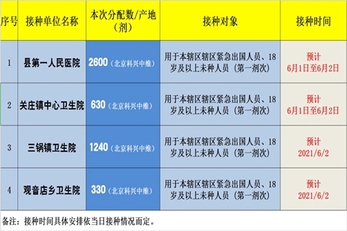 近日,我县将新到 北京科兴中维 新冠病毒灭活疫苗 4800 剂,预计到苗时间为本周周一(6月1日)。按照四川省、广元市以及我县指挥部统一安排部署,决定于6月1日启动本批疫苗的接种工作,6月2日 完成接种、疫苗清零,详细安排见下表。请市民朋友们及时关注“健康青川”微信公众号,了解我县新冠疫苗到苗情况及接种安排。