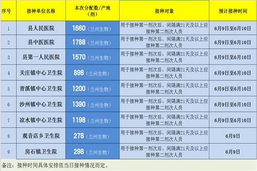 青川县2021年(第九批)新冠病毒疫苗分配表