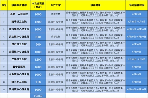 青川县2021年(第十九批)新冠病毒疫苗分配表