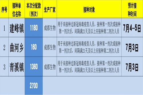 青川县2021年(第二十二批)新冠病毒疫苗分配表
