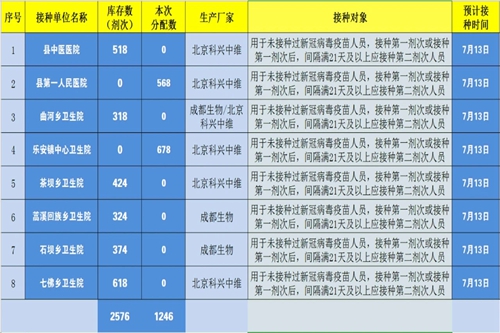 根据国家、省级有关方案和文件精神,从6月10日起,实行灭活疫苗不同生产企业产品第二剂可替代接种。我县今日新到1246剂新冠病毒灭活疫苗(北京科兴中维),上批次尚有2576剂库存(明细见下表),请市民朋友们准确掌握自己第一剂所接种疫苗品种等相关信息,积极到以下医院进行接种。凡是第一剂接种的是灭活疫苗,均可替代接种不同生产企业相同品种的疫苗(灭活疫苗)。同时,请及时关注“健康青川”微信公众号,了解我县新冠病毒疫苗接种安排。