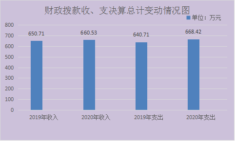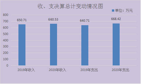 2020年度收、支总计660.53万元、668.42万元。与2019年相比,收、支总计650.71万元、640.71各增加9.82万元、27.71万元,增长1.51%、4.32%。主要变动原因是行政区划调整后,编制内实有人数增加。