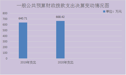 2020年一般公共预算财政拨款支出668.42万元,占本年支出合计的100%。与2019年相比,一般公共预算财政拨款增加27.71万元,增长4.32%。主要变动原因是行政区划调整后,编制内实有人数增加。