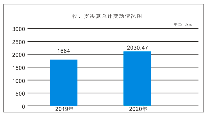 2020年度收、支总计2030.47万元。与2019年相比,收、支总计各增加346.47万元,增长20.57%。主要变动原因是人员增加,项目经费增加。