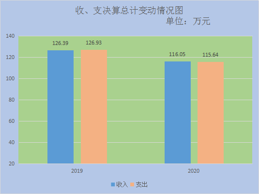 2020年度收入总计116.05万元、支出总计115.64万元。与2019年相比,收入减少10.34万元,下降8.18%,支出减少11.29万元,下降8.89%。主要变动原因是人员经费开支减少。