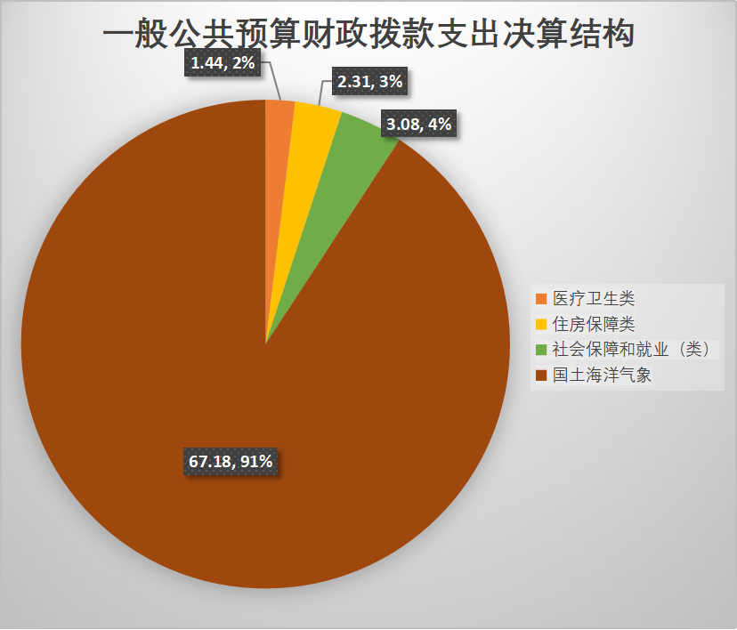 2020年一般公共预算财政拨款支出74.01万元,主要用于以下方面:社会保障和就业(类)支出3.08万元,占4%;自然资源海洋气象等支出67.18万元,占91%;卫生健康支出1.44万元,占2%;住房保障支出2.31万元,占3%。