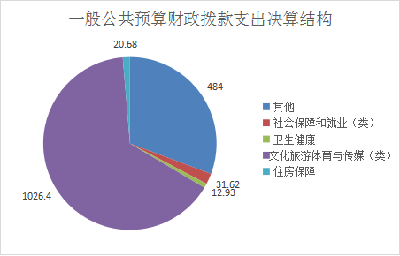 2020年一般公共预算财政拨款支出1575.62万元,主要用于以下方面:文化旅游体育与传媒(类)支出1026.4万元,占65.14%;社会保障和就业(类)支出31.62万元,占2%;卫生健康支出12.93万元,占0.8%;住房保障支出20.68万元,占1.31%;其他支出484万元,占30.75%。