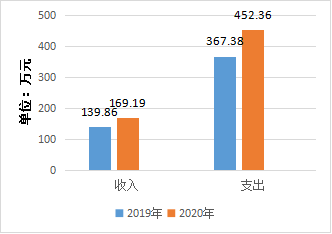 2020年度收入总计169.19万元、支出总计452.36万元。与2019年相比,收入增加29.33万元,增长20.97%。,支出增加84.98万元,增长了23.13%。主要变动原因是补发了2019年管理处局职工目标考核奖。