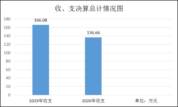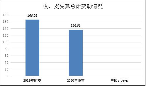 2020年度收、支总计136.66万元。与2019年相比,收、支总计各减少29.42万元,下降17%。主要变动原因是:厉行节约、政府倡导过紧日子。